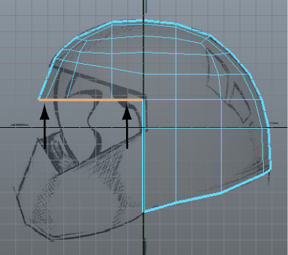 By moving the vertex as well as the vertex adjacent to it along the axis of symmetry, you ensure that the symmetrical shape of the helmet is maintained. If you move one vertex independently of the other it may result in an unwanted bump or valley in the mesh. These types of anomalies will become more apparent when you copy the completed half of the mesh across the axis of symmetry.