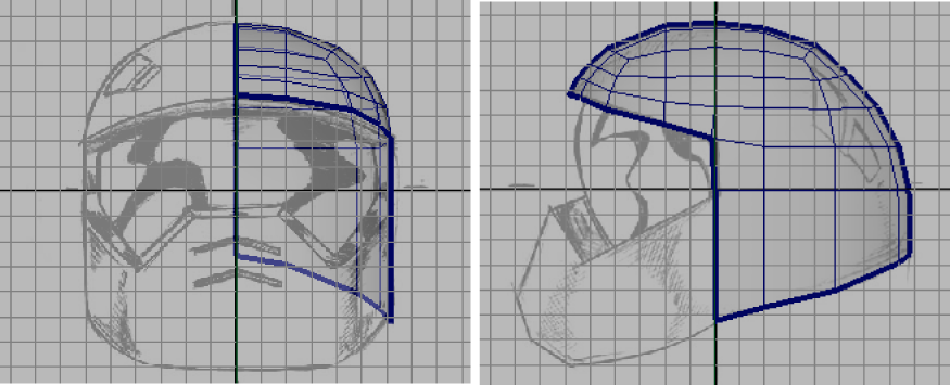 If you examine your model in the perspective view your helmet mesh should now match the reference sketches as they appear in both the front and side image planes (see image below). The mesh should also have a relatively uniform distribution of polygon faces on the mesh and the edge loops should flow smoothly.