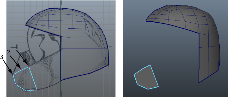 To create the lower front region of the helmet (that is, the region that would protect the mouth and jaw of the wearer) you’ll create a polygon for the cross section of the lower front region by manually placing vertices using Create Polygon.