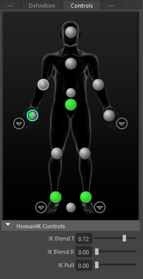 The HumanIK Controls give you finer control over the retargeting result between the FightSource and Character1 characters. These controls contain the IK Blend T, IK Blend R, and IK Pull sliders.