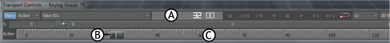 Transport Controls (detail) A. Timecode field B. Timeline indicator at frame 32 C. Action timeline