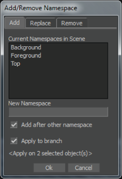 The Add/Remove Namespace dialog box appears, displaying in numeric alpha order the namespaces in the scene.