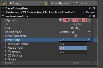 Mirror Plane list, choose an axis option. For example, to mirror animation along the global Z-Y plane, select