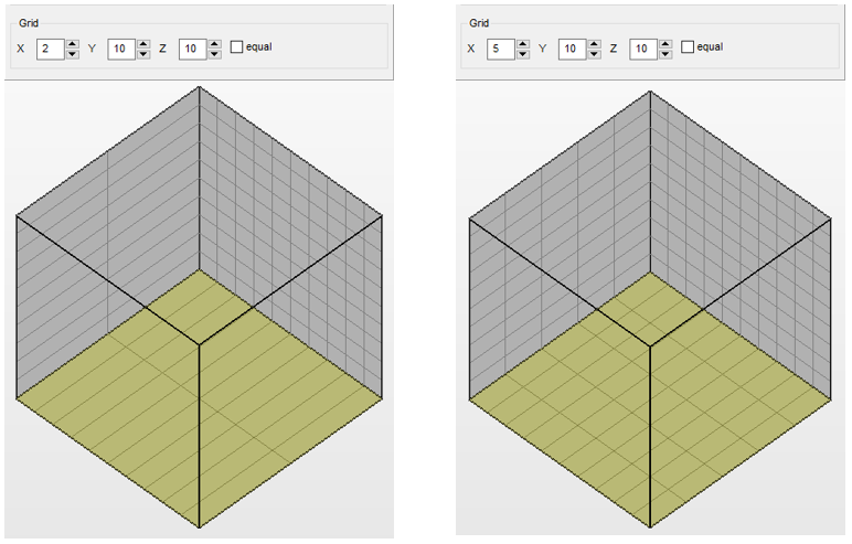 At the bottom of the tab you can change the number of grid lines across the three axes. If the Equal checkbox is enabled, there will be an equal number of grids along all three axes. If it is disabled, the grid can be adjusted to a much finer factor along selective axes, or if the cell size is set differently along the three axes, the grid squares can be made quadratic again. The number of grid lines does not have any influence on the cell size.