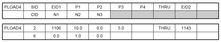 2. The continuation entry is optional. If fields 2, 3, 4, and 5 of the continuation entry are blank, the load is assumed to be a pressure acting normal to the face. If these fields are not blank, the load acts in the direction defined in these fields. Note that if CID is a curvilinear coordinate system, the direction of loading may vary over the surface of the element. The load intensity is the load per unit of surface area, not the load per unit of area normal to the direction of loading.