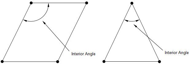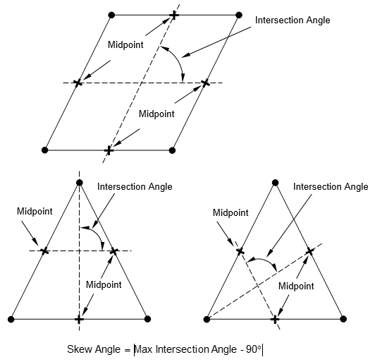 Skew angle for a quadrilateral element or solid element face is a measure of how much of a parallelogram it is relative to a rectangle. It is defined to be the angle between the lines that join midpoints of the opposite sides of the quadrilateral minus 90 degrees. A rectangle would have a zero skew angle. Skew angle for a triangular element or solid element face is a measure of how close it is in shape relative to an equilateral triangle. Skew angle for the triangular element is defined to be the angle between the lines that join midpoints of two opposite sides relative to the line through their vertex and the midpoint of the remaining side minus 90 degrees. An equilateral triangle would have a zero skew angle. Each vertex of the triangle is examined and the largest skew angle reported. Element accuracy can be sensitive to element skew angle.
