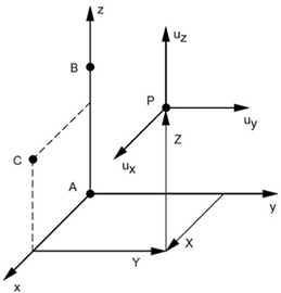 7. The displacement coordinate directions at P are dependent on the location of P as shown below by (, , ).