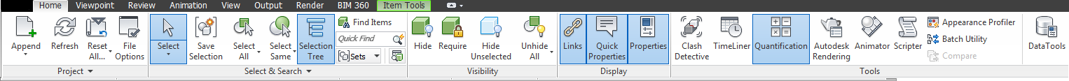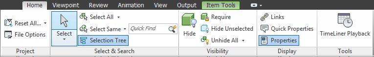 The ribbon is divided into tabs, with each tab is supporting a specific activity. Within each tab, tools are grouped together into a task-based series of panels. Some of the tabs are contextual. When you execute some commands, a special contextual ribbon tab is displayed instead of a toolbar or dialog box. For example, as soon as you start selecting items in the Scene View, the previously hidden Item Tools tab appears. When nothing is selected, it becomes hidden again.