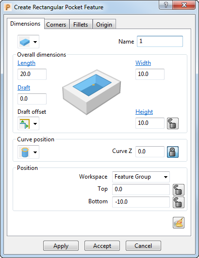 You can create features and modify their parameters using the Create Feature dialog. Click a feature creation button on the Feature Editor tab to display the Create Feature dialog.