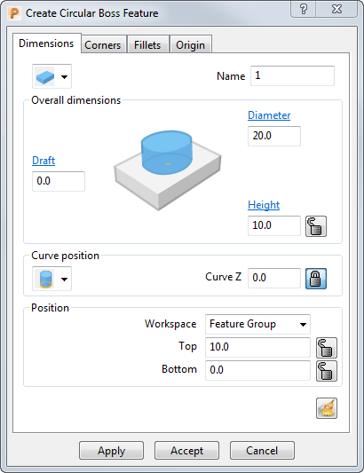 Bottom — Sets the profile curve at the bottom of the feature.Curve Z — Enter a value to specify the height of the profile curve along the Z axis. If you have specified a Draft angle, it is applied by offsetting the curve from this height.