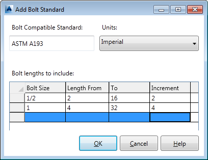 Sets the amount that the bolt length increases for each size created in the range. You can modify, add, or remove bolt lengths in the Bolt Length Mapping dialog box.