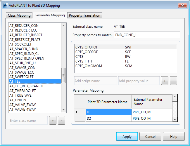 Specifies AutoPLANT property names to be matched to Plant 3D endtype graphic scripts in varying contexts. In the dialog shown. For example, the conversion mapping instruction reads as follows: if the AutoPLANT END_COND_1 is SWF, use the Plant 3D script name CPTS_OFOFOF, if it is BW, use CPTS, and so on.