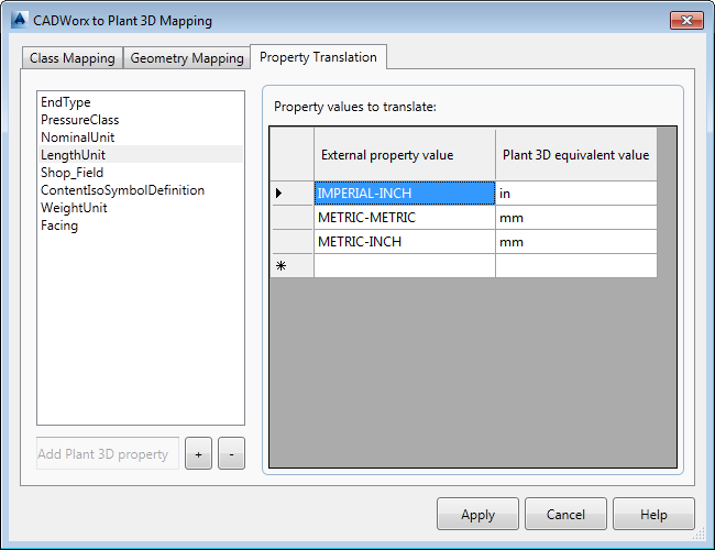 Specifies the Plant 3D equivalent value for the property selected from the list on the left pane. In the dialog shown. For example, the CADWorx IMPERIAL INCH property value maps to (translates to) in in the language of Plant 3D.