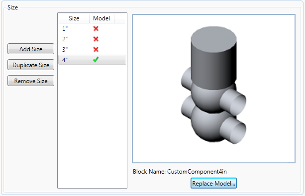 In the Catalog Editor, create a component using custom geometry. Specify the piping component class and other fixed properties of the new component. Generate an initial size range. Add and remove sizes to match the custom component blocks. Import Custom geometry for each size.