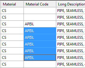 - In the table, select a cell and enter a value. For Example, specify API5L in column Material Code for 2”.