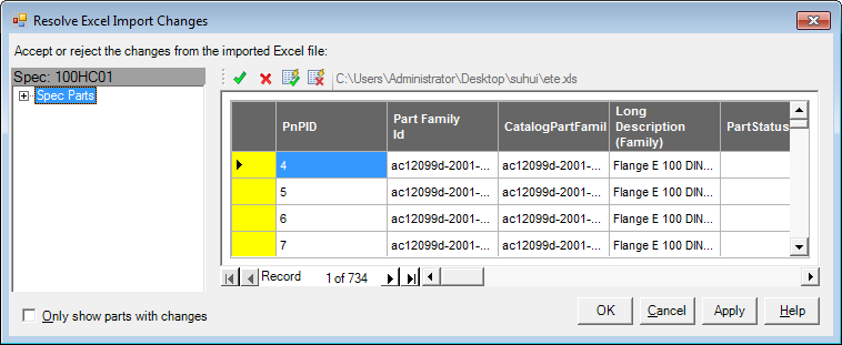 When you import Spec or Catalog parts, you can specify which changes to accept and which to reject. Importing data into the Spec Editor is like importing data into the AutoCAD Plant 3D toolset Data Manager.