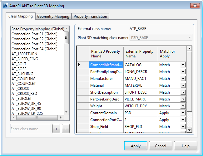 Maps global and individual class AutoPLANT properties to Plant 3D equivalents.