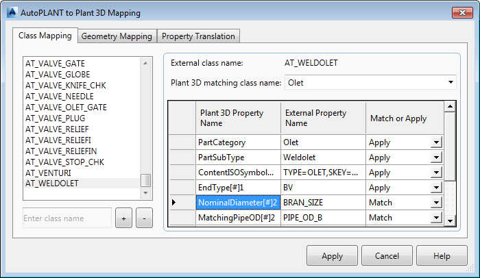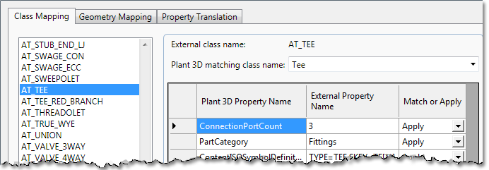 Global properties such as long description, pressure class, schedule, and so on, can be mapped once for all classes. Individual class properties, on the other hand, are mapped one-to-one to corresponding Plant 3D class properties.