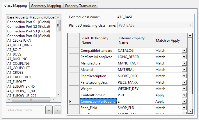 Individual class property mappings take precedence over global mappings. In the AutoPLANT to Plant 3D Class Mapping dialog box, for example, the global mapping for ConnectionPortCount is 2.