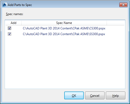 Sets the spec files to add catalog parts. A spec file must be open to appear in the list.