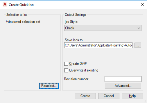 Quick Isos can be created from line numbers or by selecting objects in the 3D model. If you use a selection set, the output drawing name is UserDefinedLine.