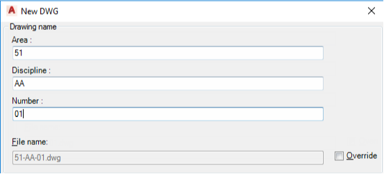 After you have configured the file name format, all files created within a project follow the pattern you set. The file-naming format is not enforced, however, and designers creating new drawings can override the format if they wish.