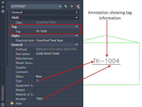 | Not text, but data. Comprised of sub parts as defined by the tag format. | Text defined in the annotation style block definition. This text can include the tag property of a component or line segment. This text is not a tag, but an annotation. |