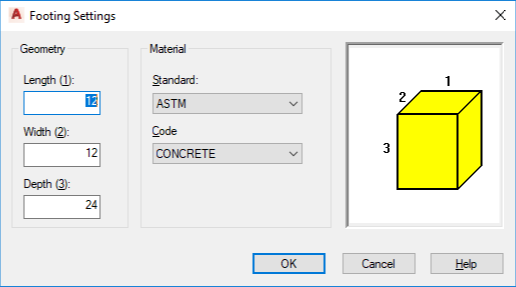 Sets the default geometry settings for footings. Numerical values indicated in parentheses correspond to the labeled geometry in the preview image.