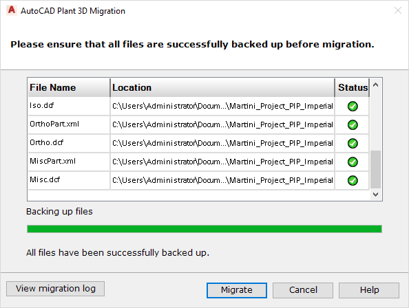- Click Next. The Project Migration Backup page shows the progress of the backup and indicates whether it successfully backs up each file.