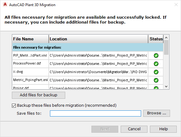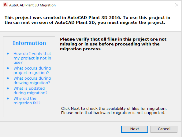 - Verify that the project and its related drawing files are closed. On the Project Migration Launch page, click Next.