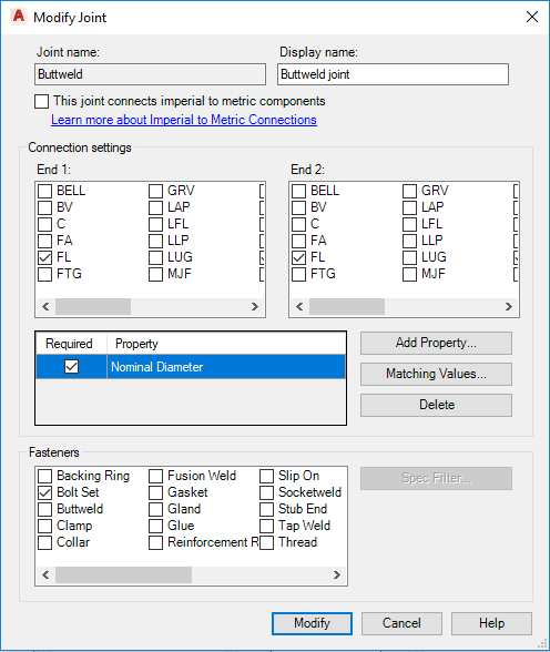Joint types that support imperial to metric connections are distinct from same-unit joint types. This allows you to specify matching properties such as 150#, 10PN.