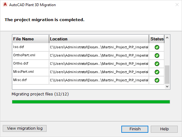 The migration process can be time-consuming, depending on the size of a project and the number of associated drawings. The Migration progress table reports successful or failed file migration and indicates the progress of the migration. Once all files successfully migrate, the project opens in AutoCAD Plant 3D toolset.
