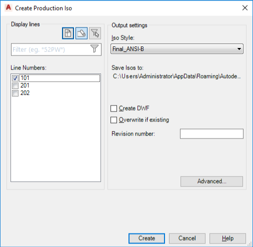 Creates a production isometric drawing. Specifies iso type, overwrite options, and DWF output.