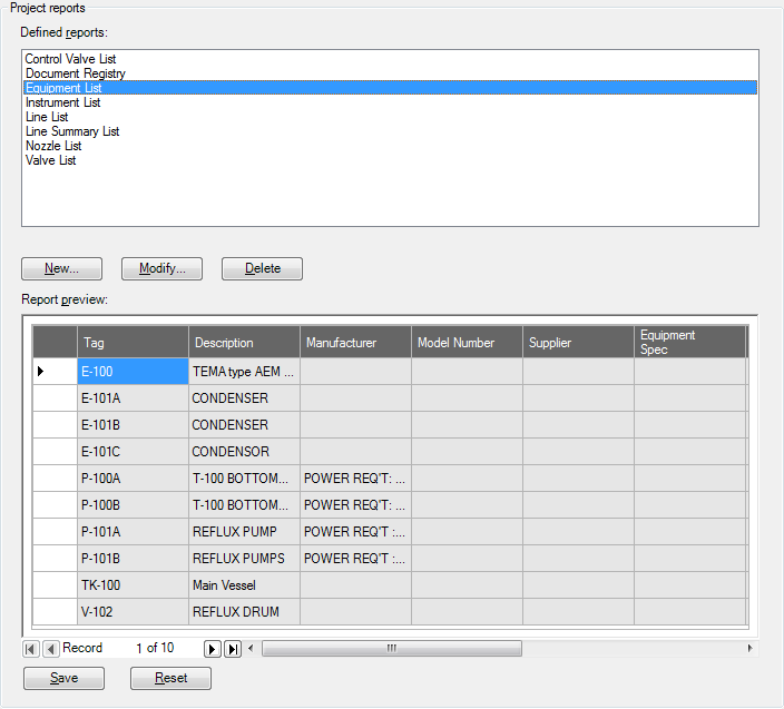- On the Project Reports pane, click a report on which to base the new report (for example: Equipment List). Click New.