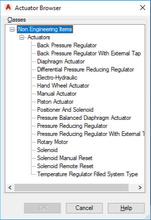 Displays a list of actuators you can select to convert a hand valve to a control valve. Click an item in the list to select it.