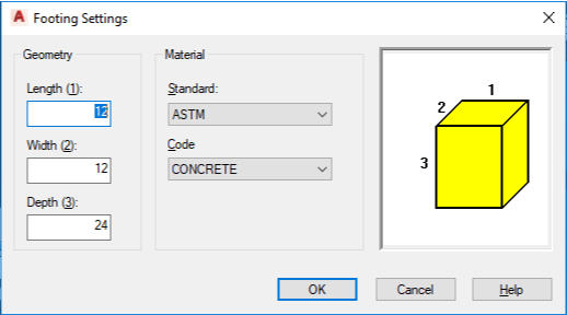 Edits the geometry settings for the selected footing. Numerical values indicated in parentheses correspond to the labeled geometry in the preview image.