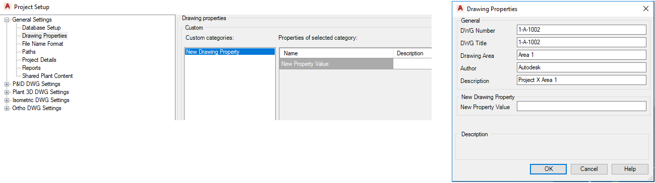 You can set properties, which include the drawing title, the drawing number, the author, the project area, and a short description of the drawing.