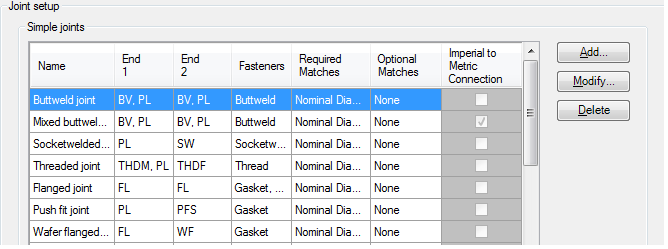 - A simple joint specifies fasteners (for example: welds or bolt sets) that are used to hold pipe together. Default simple joint types, such as welded, flanged, and socketed joints, are provided for connecting pipe with matching nominal diameter. Parts that support the connection (for example: gaskets) are also specified in a simple joint.