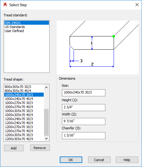 Specifies the tread standard, tread shape, and dimensions for stairs.
