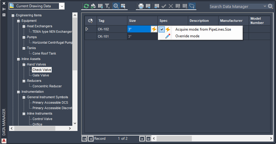 Acquisition properties in Acquire mode are displayed with a gray background in the data table. You can edit a property in Acquire mode by changing it to Override mode.