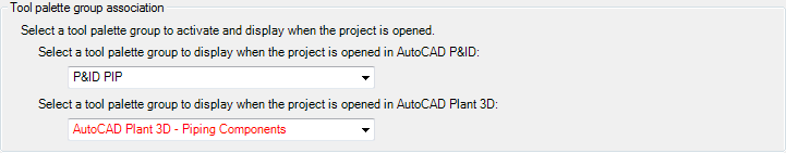 Under Tool Palette Group Association, in the drop-down lists, click tool palette groups to display when a project is opened.