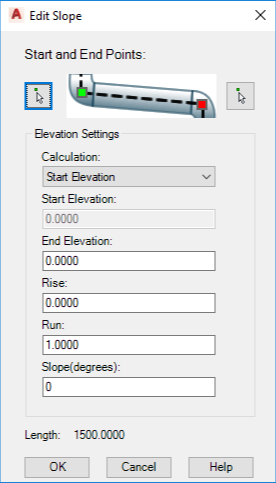 In the Calculation list, click Slope. The Slope calculation allows you to set start and end elevations. You can also use Start Elevation or End Elevation to enter a slope angle or rise.