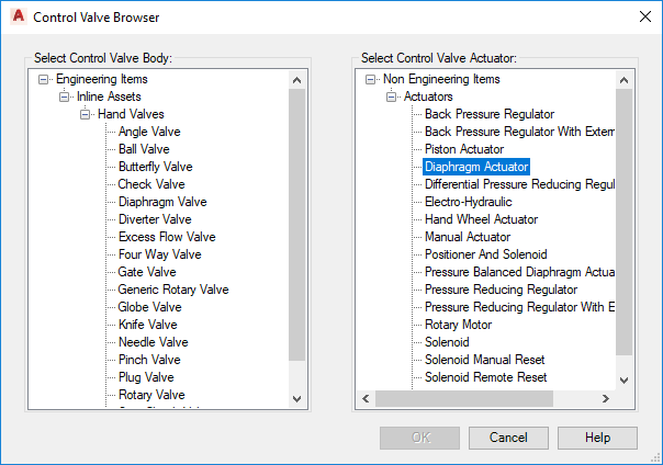 Selects a control valve body and actuator for a control valve you place in a drawing.