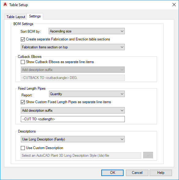 - Select or clear the Use Custom Description check box. If you select the checkbox, click the [...] button to locate the AutoCAD Plant 3D toolset Long Description Style (.lds) file you want. This file will set the format for all descriptions in the BOM. Click OK.