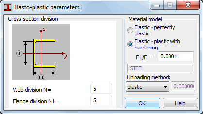 If the elastic-plastic model with hardening is selected, the E/E1 field becomes available in which you can enter a value for the plastic hardening parameter. This parameter is defined as a quotient of the material stiffness value (Young's modulus E) in the elastic range and the stiffness in the plastic range (the linear material model is assumed).