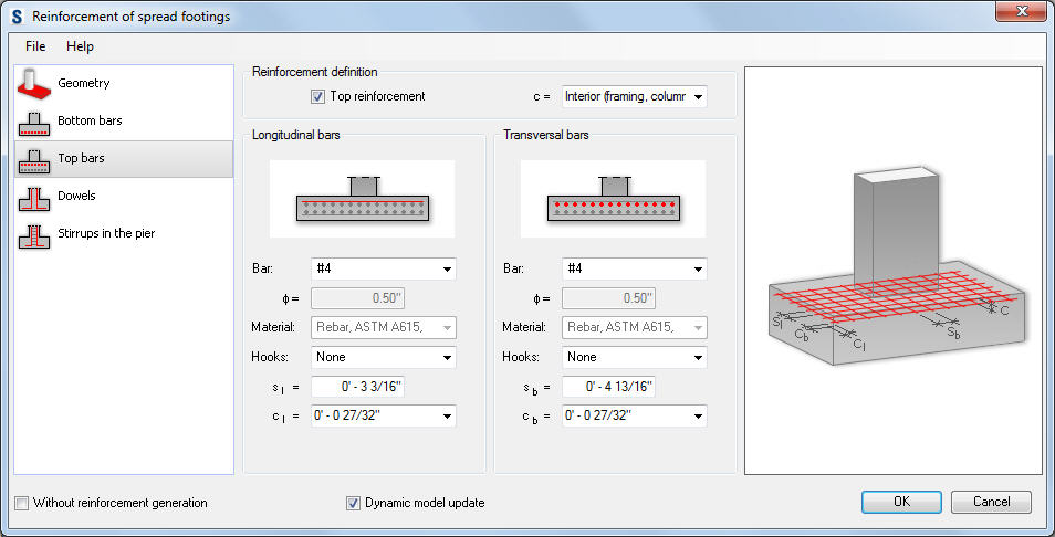 To generate top reinforcement in a spread footing, under Reinforcement definition, select Top reinforcement. You can then define parameters of top reinforcement: