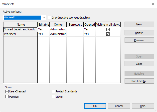 The following image shows the Worksets dialog, with the two default user-created worksets, Shared Levels and Grids and Workset1.