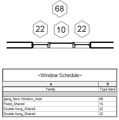 Notice the double hung windows are tagged and scheduled separately. The fixed window that was the host is not included in the schedule and not tagged. However, notice the ganged window name, Gang_Fixed Host, is listed with the subcomponents. This window represents the main window composed of the of the 3 subcomponent windows.