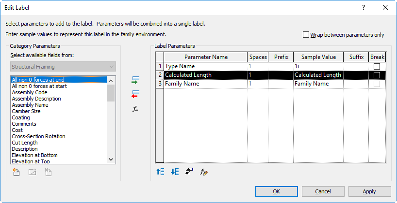 The Category Parameters window contains the label parameters related to the tag type. The Label Parameters window contains the Category Parameters that display in the label. Typically, this is a single parameter, but you can detail more complex, concatenated labels.