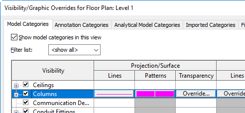 In the following image, the Columns category has overrides for projection/surface lines and patterns.